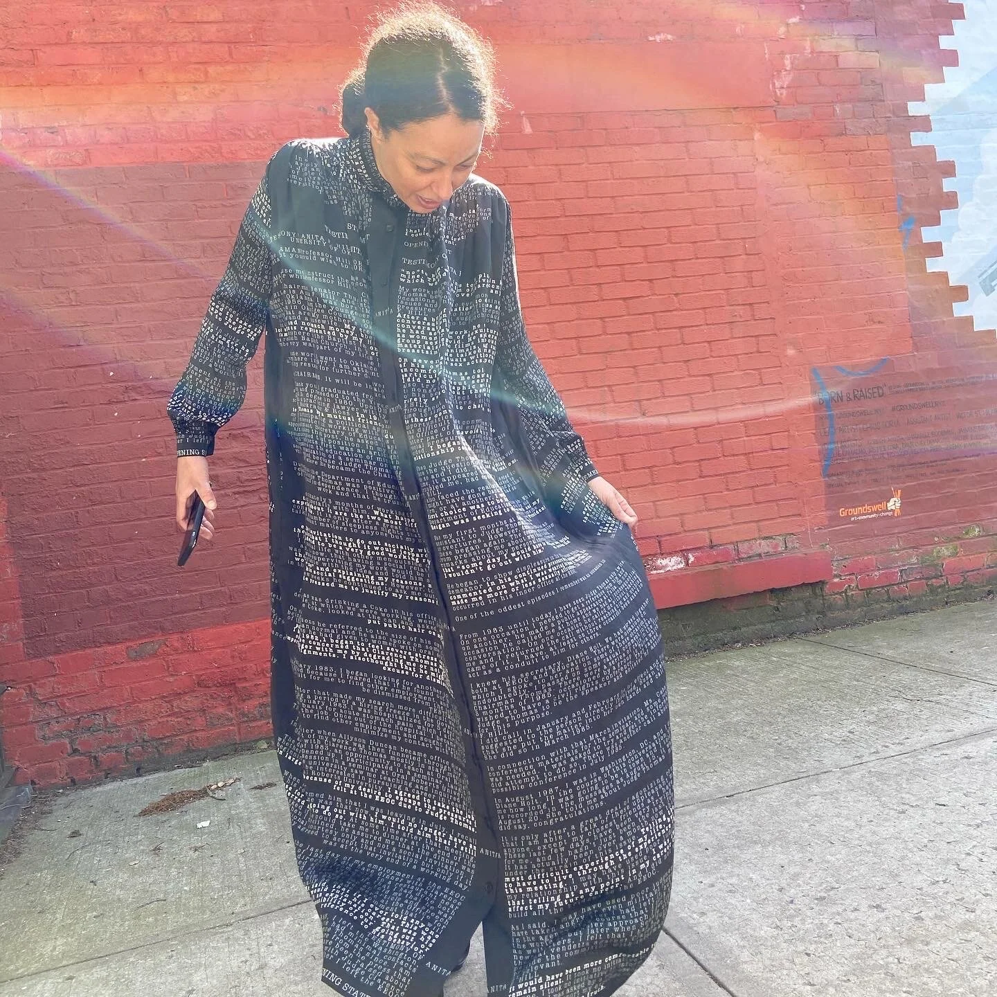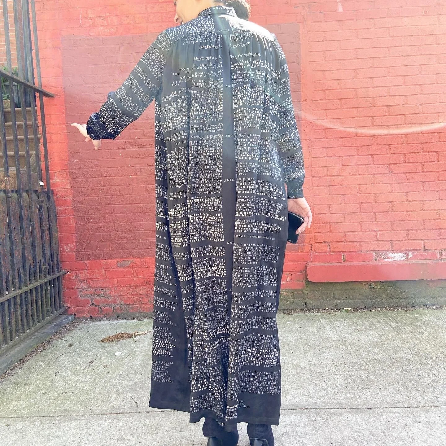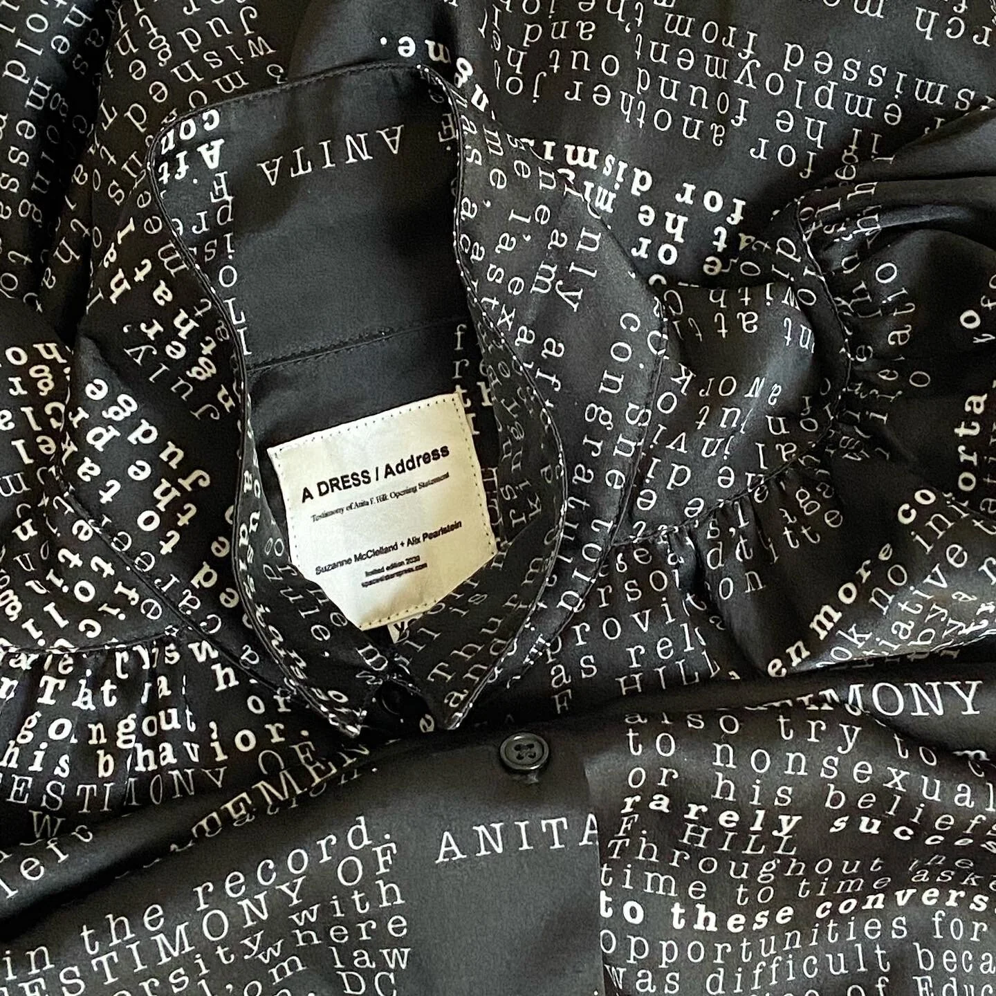 A DRESS / Address: Testimony of Anita F. Hill: OPENING STATEMENT, transcribes the entirety of her opening statement to the senate judiciary in 1991, with key remarks highlighted, onto a silk or cotton shirtdress. 2020.